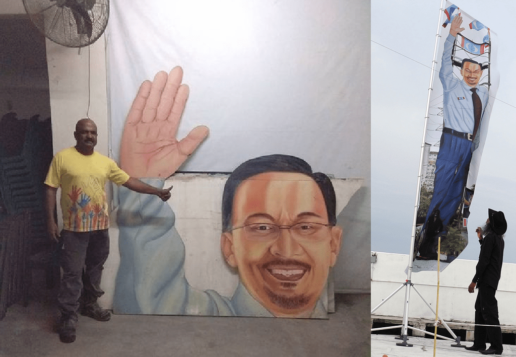Sponsor R Viriya with a section of his giant Anwar Ibrahim hoarding when it was down between Wisma Keringat (2008) and Dewan Orang Ramai, Kg Indian Settlement (2018) installations. This image of Anwar is represented in my SUPERSTAR flag which was presented at the Pokok Pauh Janggi exhibition (part of the Koboi Project) at the Kapallorek Artspace in Bandar Seri Iskandar, Perak. Pokok Pauh Janggi runs from 5th Aug – 30th Sept 2023