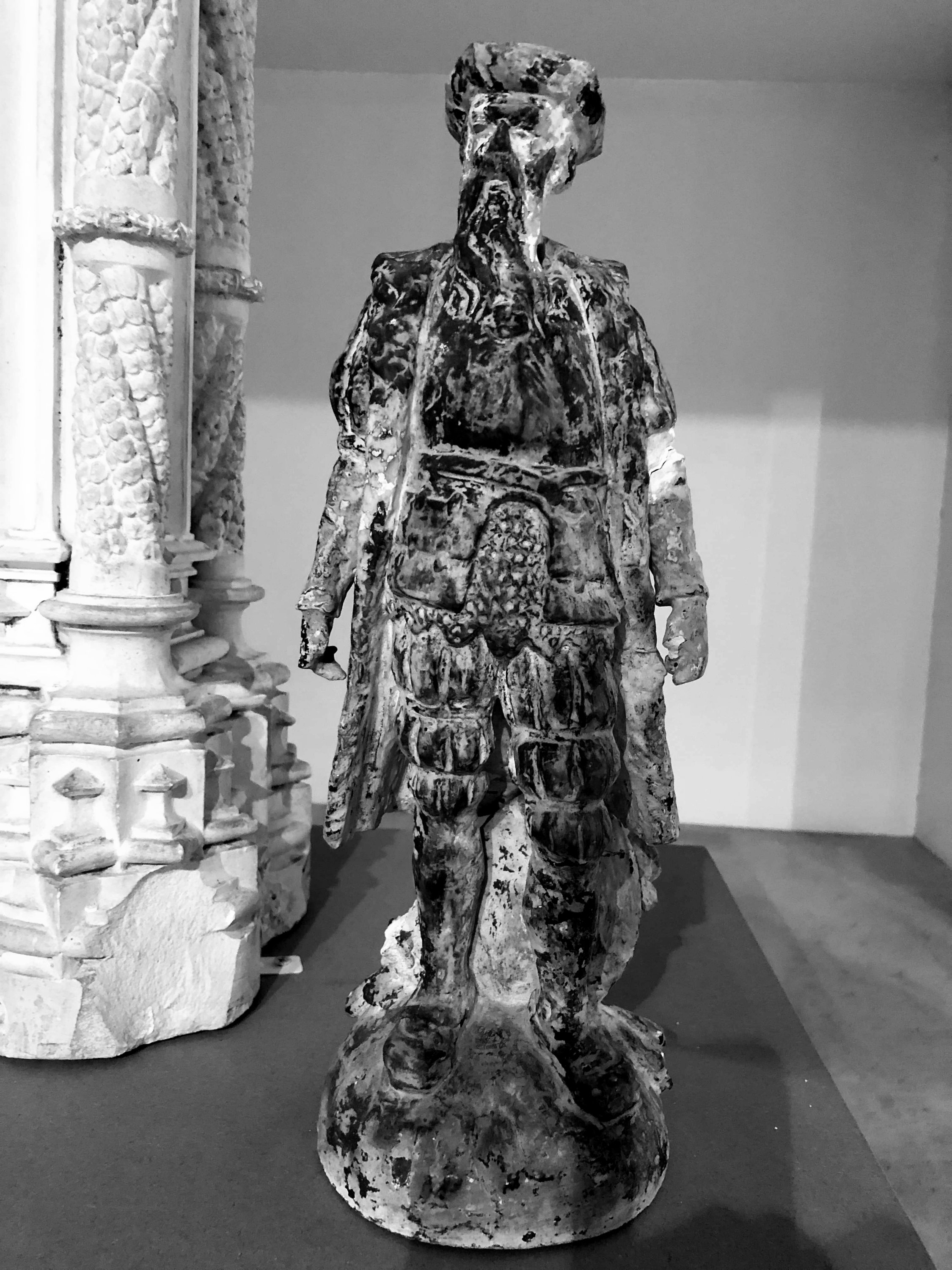 This is a patinated plaster maquette for the bronze statue of the Afonso Albuquerque memorial by Antonio Augusto da Costa Motta exhibited at the Gulbenkian Museum. It stands beside the model for the column of the monument. This was a wonderful discovery, as the memorial, which was completed in 1901, is so tall that one cant fully appreciate the details of the figure from the ground.